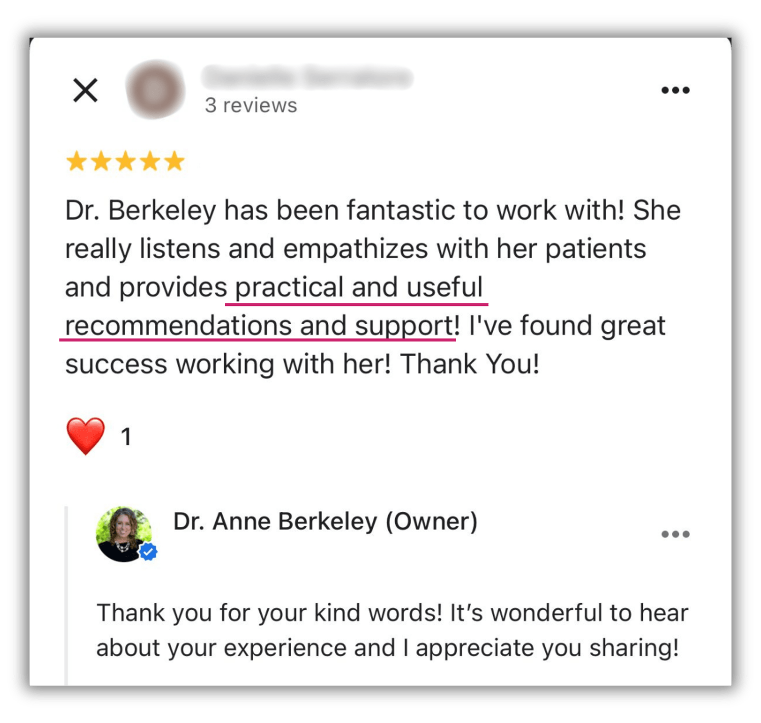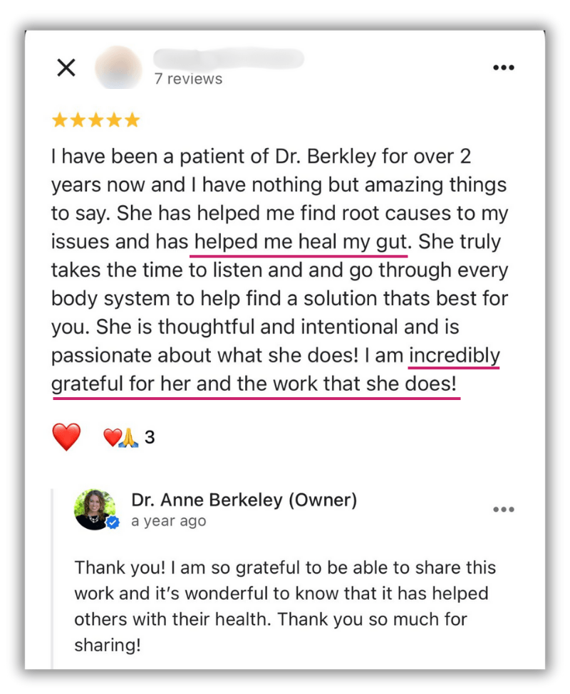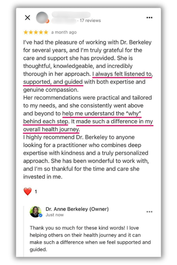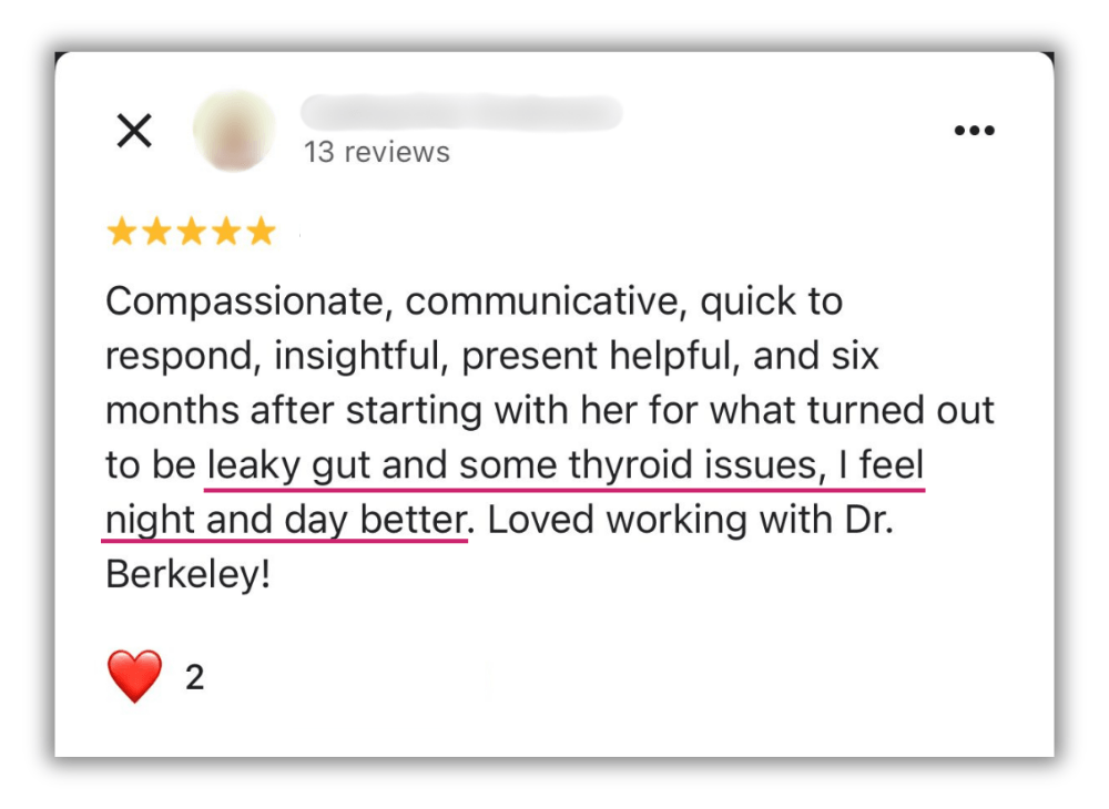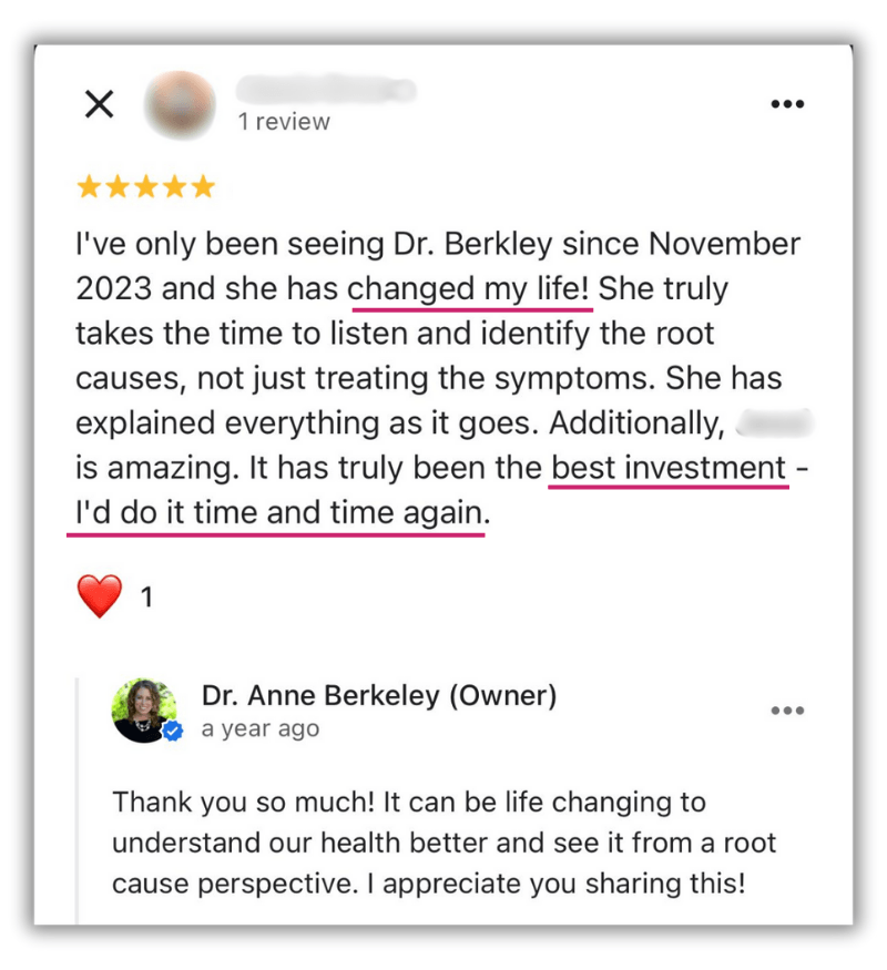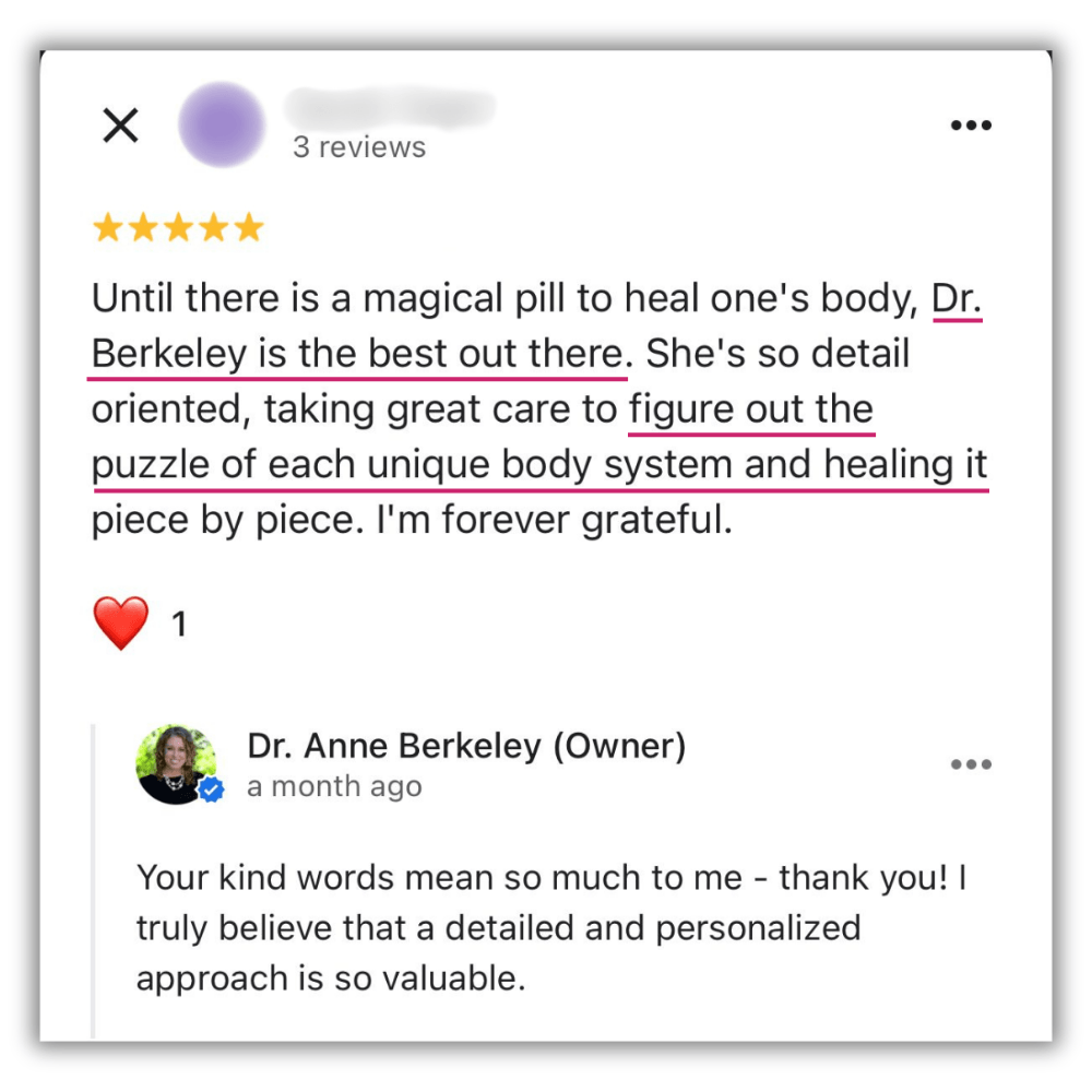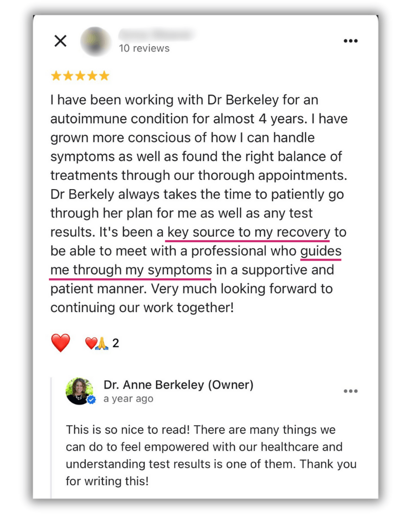 The information and content on this website is provided for educational and informational purposes only. Nothing stated or posted on this website is medical advice, diagnosis, treatment or services to any individual nor is it intended to diagnose, treat, cure or prevent any disease. The information provided in this website, or through links to other sites, is not a substitute for medical or professional care, and you should not use the information in lieu of the advice of a physician or other qualified health care provider familiar with your personal situation and health. Always seek the advice of your physician or other qualified health care provider before making any medical or lifestyle changes. Your viewing the information on this website, contacting us or purchasing a product or program on this website, if offered, does not create a doctor-patient relationship between you and Dr. Anne Berkeley, ND, or any doctor or healthcare provider affiliated with our website. Any information and statements regarding dietary supplements have not been evaluated by the Food and Drug Administration and are not intended to diagnose, treat, cure, or prevent any disease. Please see our full Disclaimers at the link below before using this website. If you believe you have a medical emergency, immediately call 911.